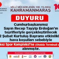 Kahramanmaraş Büyükşehir Belediyesi’nden yapılan yazılı açıklamada: “Daha önce 12 Şubat Stadyumu’nda gerçekleştirilmesi planlanan Kurtuluşun 100. Yılı final Programı hava hava koşulları sebebiyle Kahramanmaraş Otogarı arkasında bulunan Merkez Spor Kompleksinde gerçekleştirilecektir. Cumhurbaşkanımız Sayın Recep Tayyip Erdoğan’ın katılımı ile Merkez Spor Kompleksi’nde gerçekleştirilecek program saat 13.00’te başlayacaktır. Tüm halkımıza duyurulur” denilerek bilgi verildi.