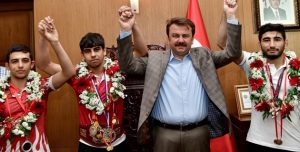 Dünya Serbest Stil Güreş Şampiyonu Hamza Alaca, Yıldızlar Avrupa İkincisi Halil Gökdeniz ve U23 Avrupa Üçüncüsü Ertuğrul Kahveci, Büyükşehir Belediye Başkanı Fatih Mehmet Erkoç’u ziyaret ettiler.