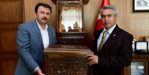 Ziyaret sonunda Başkan Erkoç, Prof. Dr. Oğuz Öcal’a Maraş işi Ceviz Oyma Çeyiz Sandığı hediye ederek teşekkür etti.